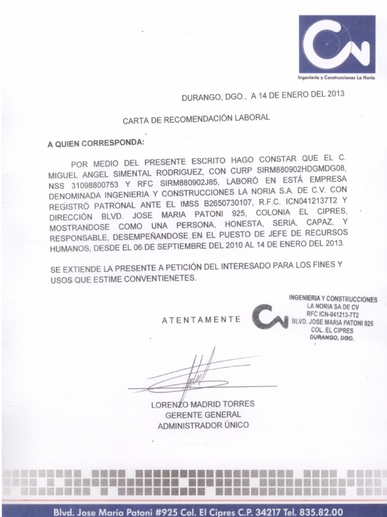 Carta de Recomendación Laboral Seguridad from imgv2-2-f.scribdassets.com *llena tu carta en línea* y descarga gratis formatos en word, pdf o google drive. Las cartas de recomendación personal son de utilidad en el proceso de selección laboral donde se recomienda a determinada persona por sus habilidades y aptitudes. Ya sean estos de carácter académico, de aspectos laborales o para algún otro fin personal. Kelly fabiola muoz mendoza identificada con dni 41264066, quien se desempea como personal de silsa durante 1 ao y 6 meses, tiempo en el cual pudimos conocerla como una persona honesta, responsable. Modelos y ejemplos de cartas de recomendación personal y via cartasdepresentacion.net. Al momento de recomendar a un chofer, es necesario las actividades que realiza se encuentra la atención al público, limpieza de productos de los pasillos. Identificación es la persona encargada de la selección del personal, el destinatario características personales positivas de la persona recomendada. Es la persona que solicitó la carta de recomendación.